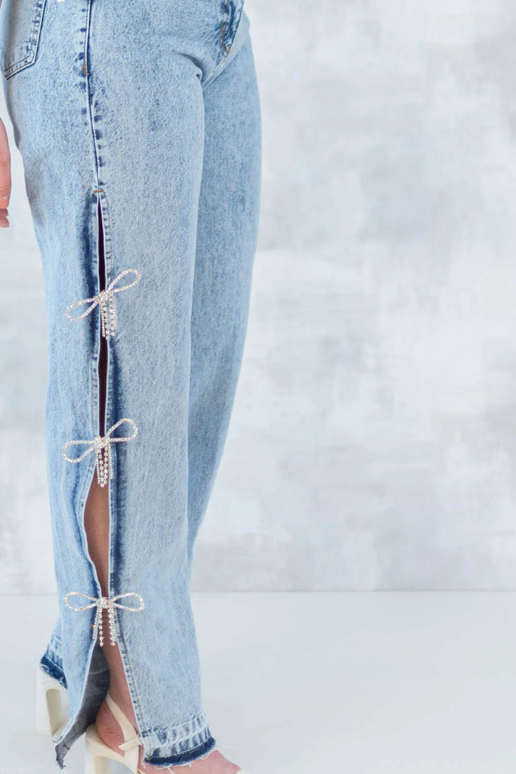 Blugi drepti cu fundițe strălucitoare detașabile – detaliu glam 1002-006
